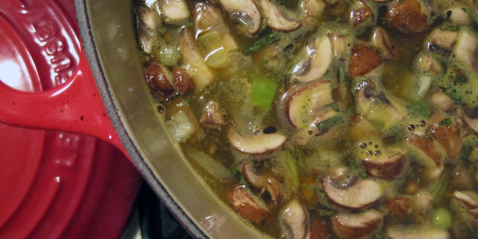 1. [Verwarm] [het] [water] [en] [voeg] [vervolgens] [bouillon] [en] [champignons] [toe] [STOP]