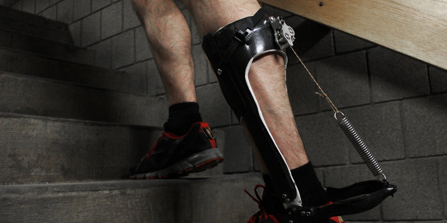 Stephen Thrift/North Carolina State UniversityOnderzoekers van Carnegie Mellon University en North Carolina State University doen de truc nu zónder dat er een externe energiebron voor nodig is. Ze publiceren deze week in Nature over een systeem waarmee een veer aan het onderbeen wordt bevestigd. Doordat het de kuitspieren ontlast, gaat lopen tot zeven procent efficiënter. Dat is volgens de onderzoekers te vergelijken met het verschil tussen lopen met of zonder een rugzak van vijf kilo.