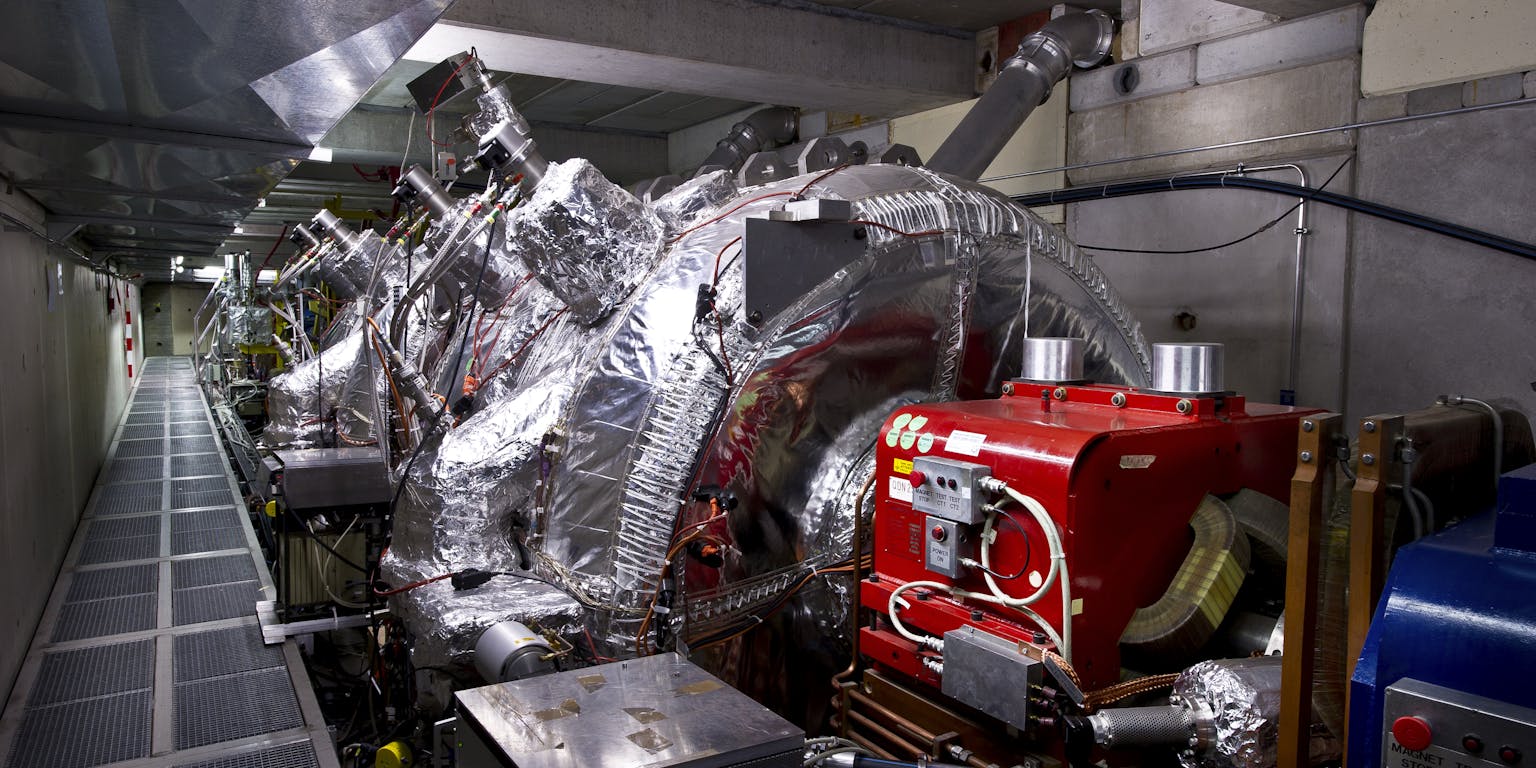 Deeltjesvertrager ELENA in de antimateriefabriek van CERN. Deze remt antiprotonen uit een grotere vertrager verder af zodat ze geschikt zijn voor experimenten in de fabriek.