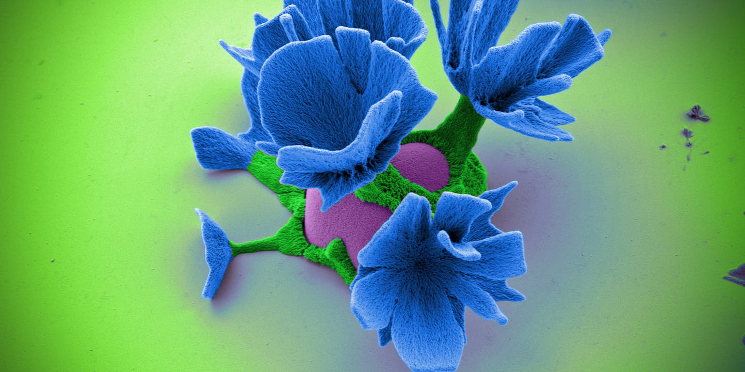 To make these architectures, we start by growing a coral structure (red). We then nucleate the green stems inside the cavities of the coral structure. While the stems are growing, we open them with a CO2 pulse (purple). (False colored SEM image)