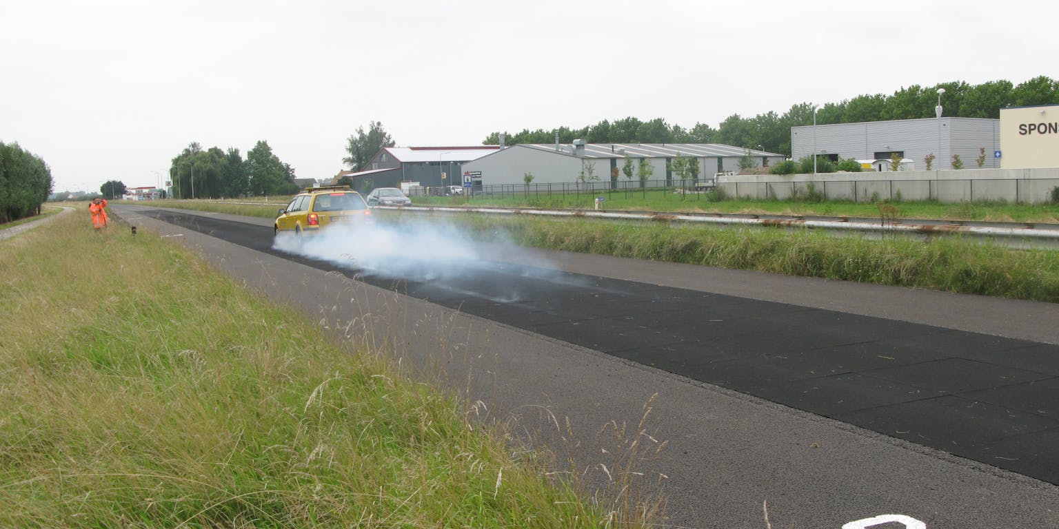 “We hebben veertig testtegels gemaakt. En ze bijvoorbeeld op parkeerplaatsen beproefd, maar nog niet op de snelweg. We ontdekten dat de geluidsreductie prima was. We haalden negen decibel reductie. Maar het asfalt ging nog niet lang genoeg mee, slechts drie maanden. Er bleef teveel water instaan, waardoor het asfalt te snel slijt en niet stroef genoeg is”, aldus Hofman.