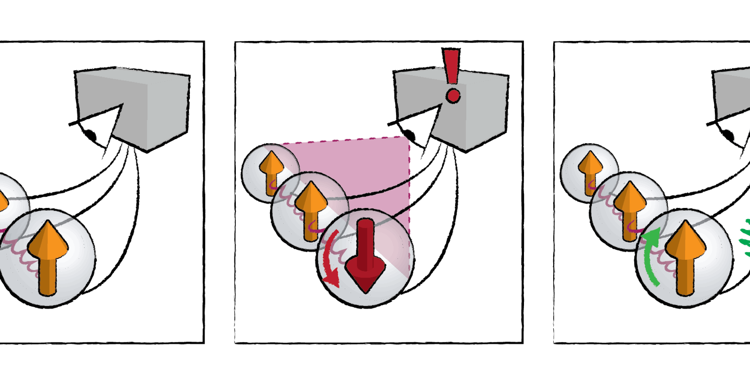Het principe van quantumfoutcorrectie: eerst wordt een quantumtoestand opgeslagen in meerdere quantum bits. Vervolgens worden deze quantum bits vergeleken met metingen: zijn ze nog hetzelfde of niet? De gedetecteerde fout wordt gecorrigeerd en alle informatie is er nog!