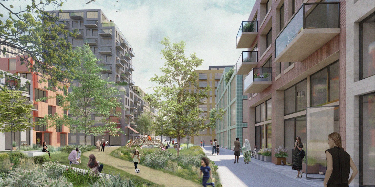 Beelden uit een gelukkige samenleving over heel wat jaren? Nee, deze toekomst is een stuk dichterbij: dit wordt de nieuwe Utrechtse wijk Merwede. Medio 2023 gaat hier naar verwachting de eerste heipaal de grond in. Een bijzondere wijk, want blik is niet welkom. Met zesduizend woningen zal dit de grootste autovrije buurt van Europa worden. Vandaar dus het ontbreken van gezinswagens en het bijbehorende asfalt op de sfeertekeningen.