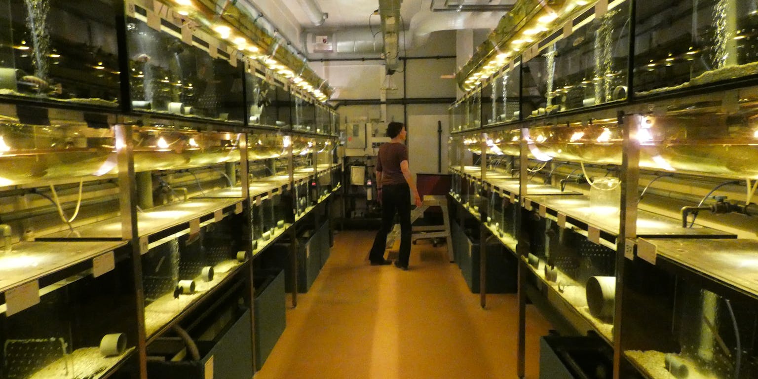 Blauw licht in het vissenlab van hoogleraar Martine Maan van de Rijksuniversiteit Groningen