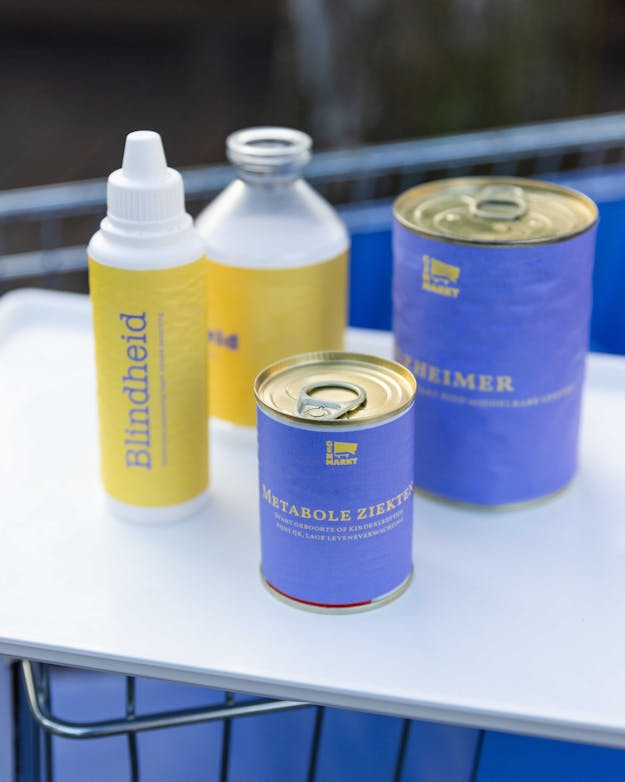 Hij wijst naar de blikjes met Corona en Alzheimer: “We hebben gezien wat voor impact corona heeft gehad op de samenleving. Dat raakte iedereen. Als ze dat virus eruit zouden kunnen knippen, zou dat geweldig zijn.” Datzelfde geldt voor Alzheimer, een ziekte waar hij in zijn directe omgeving mee te maken heeft. Over het flesje Kaalheid, met daarin een genetische aanpassing tegen haaruitval, is hij minder enthousiast: “Tja, is dat erg? Je hebt tegenwoordig ook hele goeie pruiken toch?” Het winkelkarretje vindt hij een aansprekende manier om over het thema in gesprek te gaan: “Het is een beladen onderwerp, en dit valt op en nodigt uit om erover na te denken.”