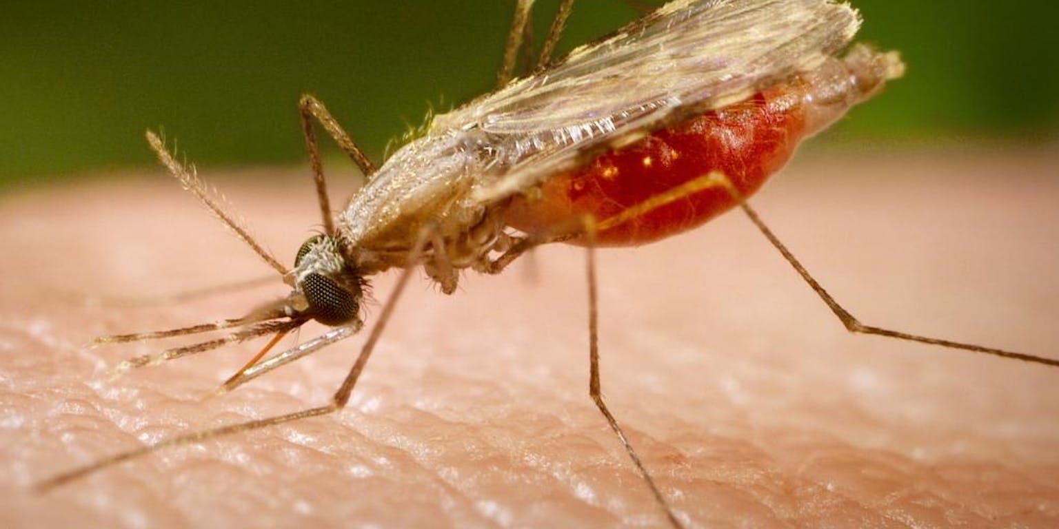 Een malariamug die bloed zuigt bij een mens. Als de mug besmet is met de malariaparasiet Plasmodium falciparum, brengt hij die op dit moment over op de mens, die dan malaria krijgt.