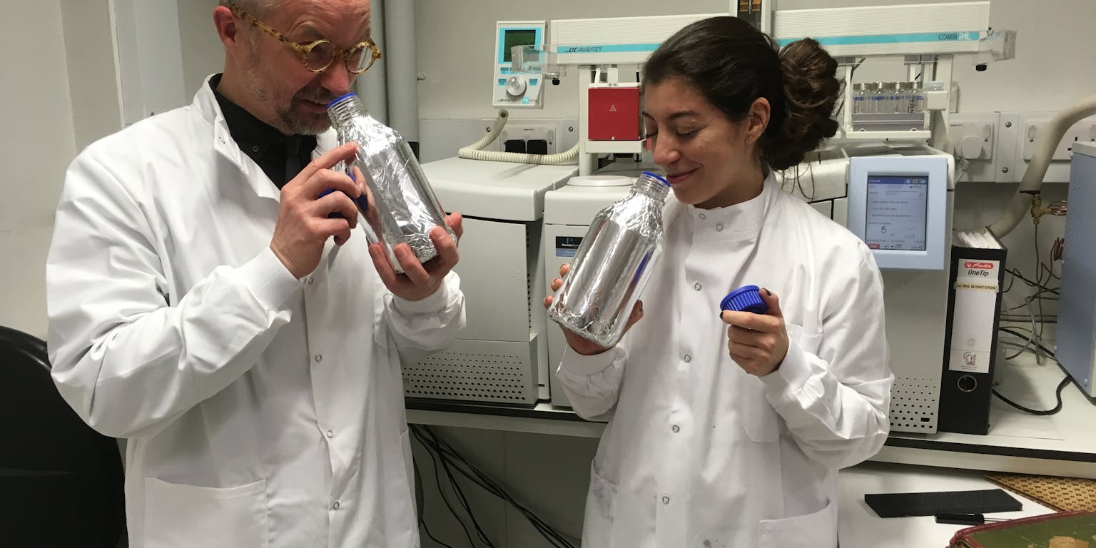 Geuren kunnen we dus vaak lastig omschrijven én niet bewaren door ze in een vitrine te leggen. Wanneer ze onderdeel van ons cultureel erfgoed worden, is het noodzakelijk om ze correct te identificeren en vervolgens te conserveren en te beschermen. Hier kwam het chemische onderdeel van het onderzoek om de hoek kijken. De onderzoekers voerden verschillende chemische analyses uit van de vluchtige organische verbindingen die verantwoordelijk zijn voor de geur die we waarnemen. Deze stoffen vervliegen heel snel en zijn in lage concentraties al te ruiken. Een geur is altijd een mengsel van heel veel verschillende stoffen en door de lage concentraties is het lastig om precies te bepalen welke stoffen je allemaal ruikt. Maar zeker bij sterke geuren is een aantal stoffen dominant aanwezig en die bepalen onze eerste associatie met een geur.