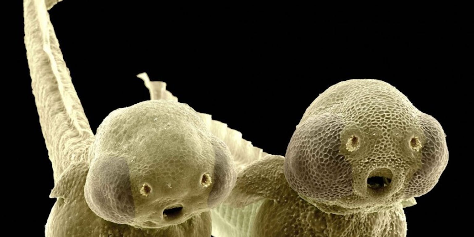 In een verlicht, rond venstertje naast het scherm zijn embryo’s van zebravisjes te zien: zwarte puntjes met een glazen staartje eraan, nog geen anderhalve millimeter lang. “Om zo diep in de cellen te kunnen kijken moet je zo’n embryo vijfhonderdduizend keer vergroten”, vertelt Ilse van Zeeland, inhoudsontwikkelaar van de tentoonstelling. “In die maximale vergroting ben je ingezoomd op een foto van achthonderd bij vierhonderd meter, bijna twee keer zo groot als het Malieveld.”