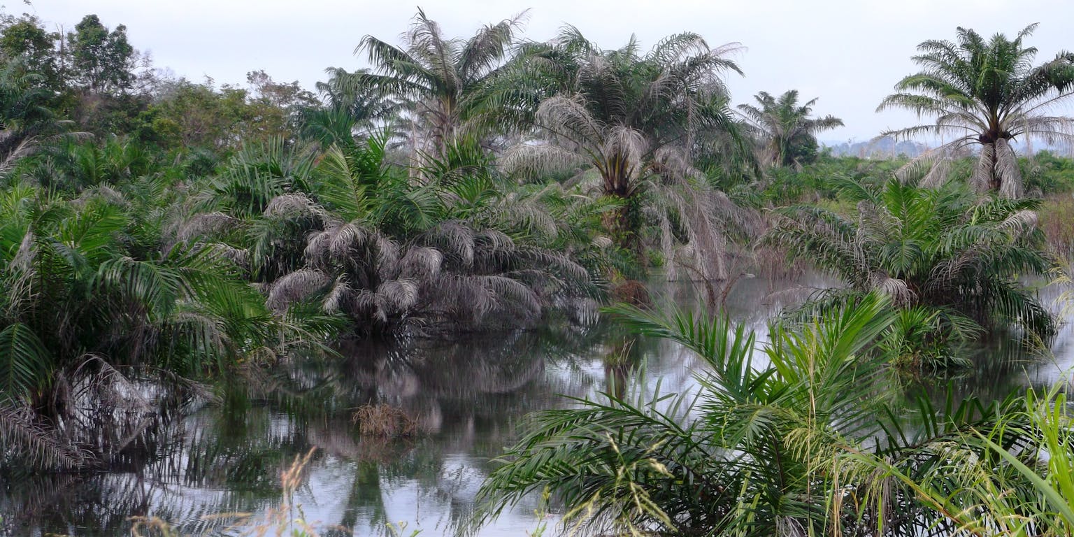 Ondergelopen land met palmbomen in Maleisië. In Zuid-Oost Azië is de bodemdaling het grootst. Miljoenen mensen dreigen hierdoor hun land te verliezen.