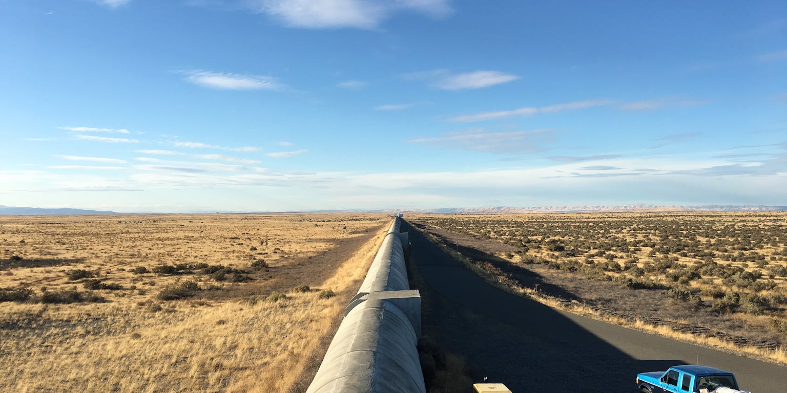 Merkwaardig zijn de twee kaarsrechte betonnen ‘armen’ die links en rechts uit het blauwwitte gebouw steken en in de verte aan de horizon verdwijnen. Als ik goed kijk zie in die richtingen ook gebouwen, naar verluidt de uiteindes van de armen op vier kilometer afstand. Meer indruk maakt de omgeving: de onmetelijke leegte van het dorre binnenland van de staat Washington in het noordwesten van de Verenigde Staten.