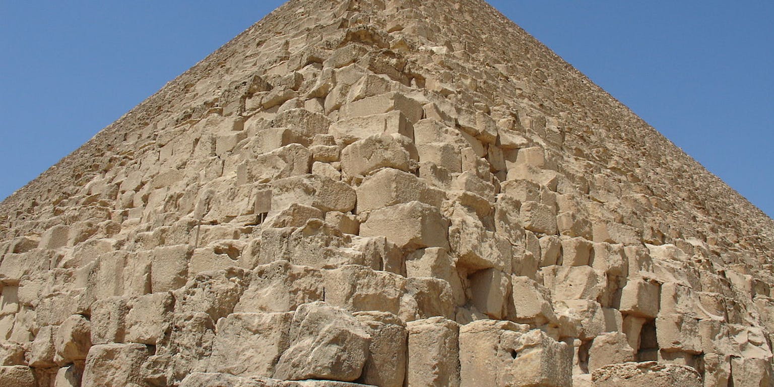 Strabo bezocht ook Egypte en schreef over de piramiden van Gizeh: “Een buitengewoon iets dat ik bij de piramiden zag mag niet onvermeld blijven. Voor de piramides liggen nog steenbrokken afkomstig uit de groeves. Daarbij zijn bestanddelen die qua vorm en afmetingen op linzen lijken. Sommigen zien eruit als half gepelde korrels. Deze, zo zegt men, zijn de resten van het voedsel van de werklui die in steen zijn veranderd, wat niet waarschijnlijk is”. (Geografie, boek XVII, hfst. 34.)