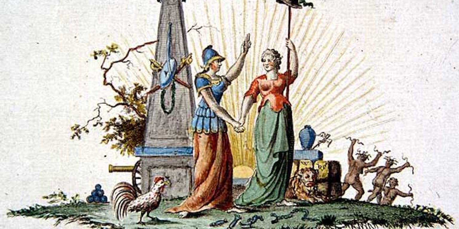 Ook tijdens onze eigen Bataafse Revolutie werden hier en daar symbolen van vostelijke macht stukgeslagen, vooral in Friesland. Maar omdat Nederland nooit een sterk koningshuis had gekend zoals in Frankrijk en de symbolen van de katholieke kerk al gemarginaliseerd waren tijdens de Beeldenstorm (1566), ging het hier allemaal veel minder gewelddadig. Maar ook in Nederland gebruikten de nieuwe machthebbers sjablonen uit het verleden. De naam van het nieuwe land, de Bataafse Republiek, alleen al was zo’n symbool. Bij de heldhaftige Bataven, die op slimme manier samenwerkte met de Romeinen en zich er uiteindelijk van los maakten, lag de bron van de Nederlandse vrijheid.