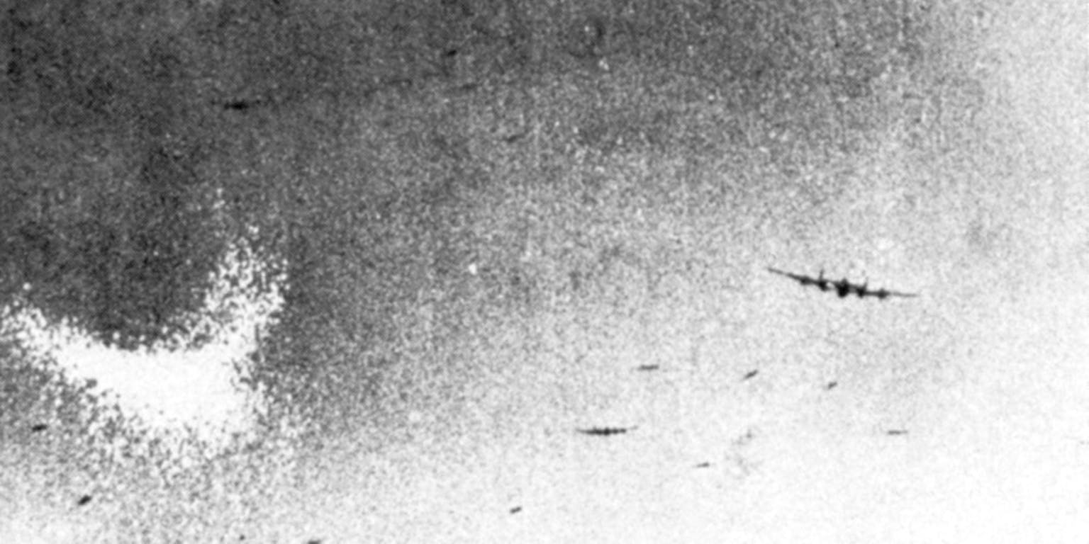 Een Lancaster bommenwerper loost tijdens een luchtaanval op Duitsland een lading chaff (links op de foto) om de Duitse radar te verblinden.