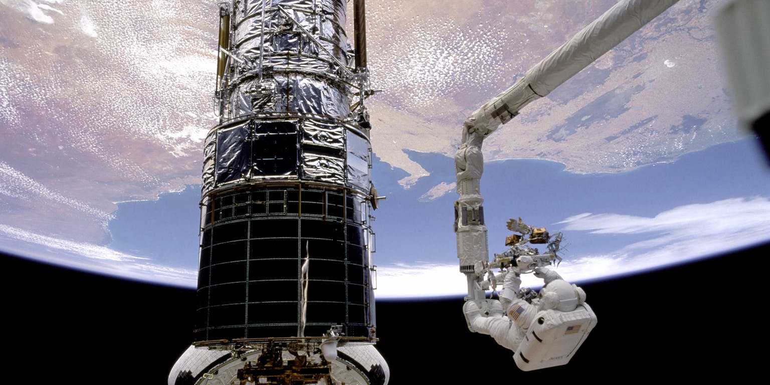 De Hubble-telescoop, gekoppeld aan een Spaceshuttle tijdens de eerste reparatiemissie in 1993.