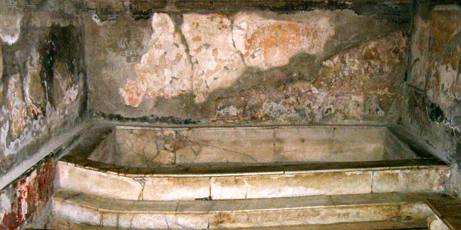 Een marmeren bassin (labrum) in de heetwaterzaal (caldarium) van de vrouwenafdeling van de Centrale thermen in Herculaneum, een Romeinse stad vlakbij de berg Vesuvius.