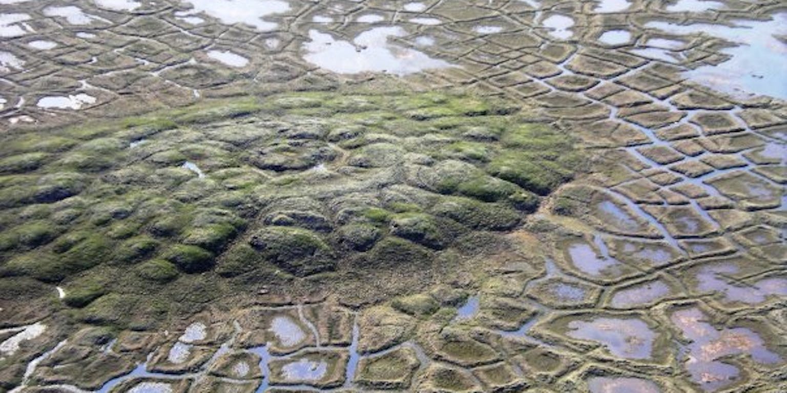 Pingo met ijswigpolygonen in Canada. De meertjes tussen de ijswiggen zijn gevuld met water uit de ontdooide permafrostlaag. Ook deze verschijnselen waren in ons land tijdens de ijstijden geen uitzondering. Nu herinneren pingoruïnes en met met zand en klei opgevulde ijswiggen nog aan die tijd.