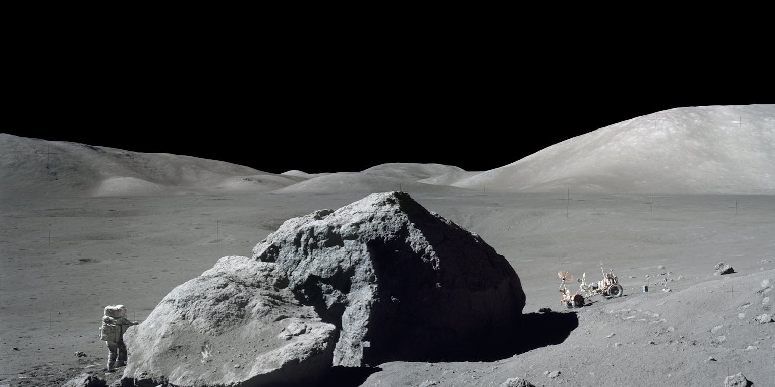Astronaut Harrison Schmitt maakt in 1972 een uitstapje op de maan. Rechts staat de maanrover geparkeerd. Samen met Eugene Cernan was Schmitt de laatste persoon die een bezoek bracht aan de maan.