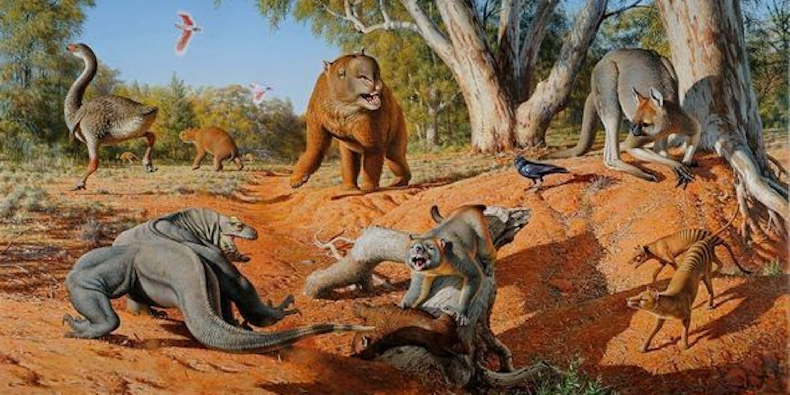 Hagedissen van meer dan 7,5 meter, wombats van meer dan 2 ton, kangoeroes van bijna 500 kilo, en schildpadden zo groot als een auto… In Australië liepen ongeveer 400.000 jaar geleden (in het midden van het Pleistoceen) enorme dieren rond. Ze bevolkten het continent tot zo’n 45.000 jaar geleden, waarna 85 procent van de giganten uitstierf. Maar waardoor? Daarover breken wetenschappers zich al jaren het hoofd. Kwam het door een plotselinge verandering van het klimaat? Of was het toch de schuld van de eerste Aboriginals die het land koloniseerden?