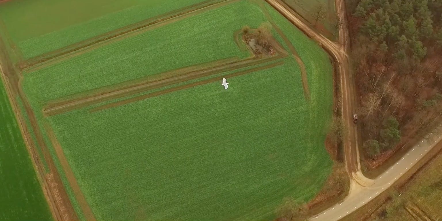 The Drone Bird CompanyOnopvallend glijdt een meeuw over natte akkers en bospercelen. Maar als je wat beter kijkt lijkt er iets niet te kloppen. Deze vogel klapt helemaal niet met zijn vleugels en ook vliegt hij nogal snel. Wanneer je inzoomt komt de aap uit de mouw: aan zijn staart draait een geruisloze propeller. Dit is de nieuwe AVES-drone van het bedrijf The Drone Bird Company uit Enschede die afgelopen mei werd aangekondigd.
