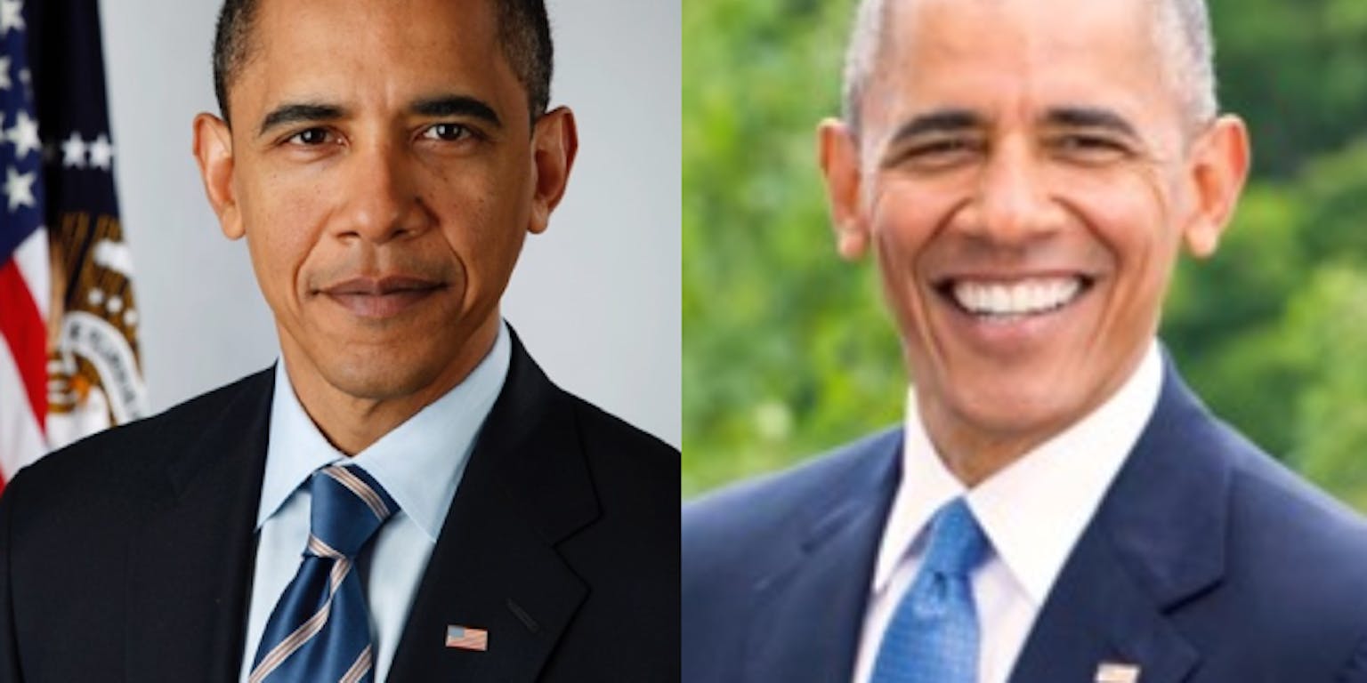 Barack Obama aan het begin van zijn presidentschap in 2009 (links) en aan het einde in 2017 (rechts).