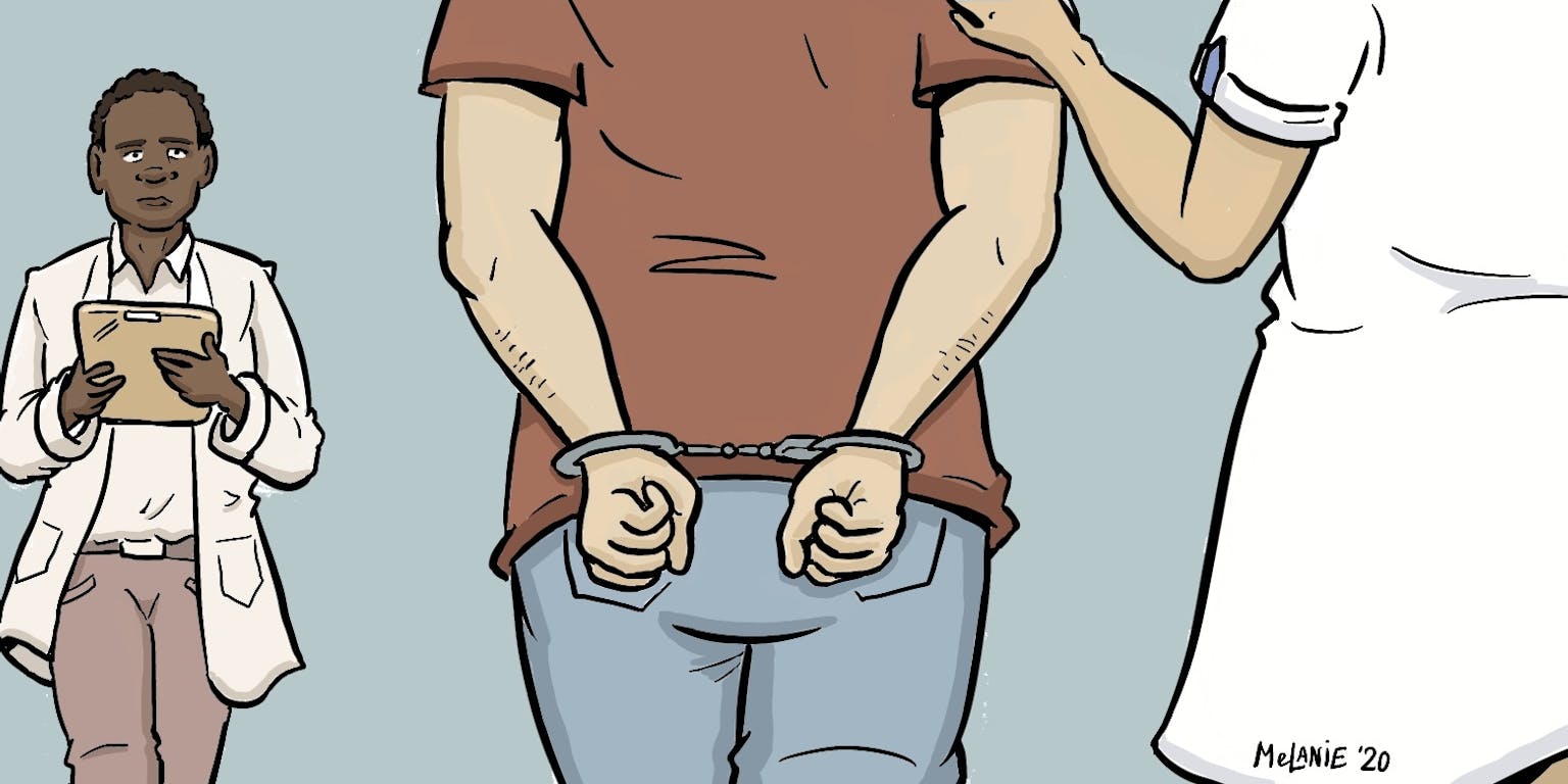 Eric (49) zit op een andere afdeling van het Justitieel Complex Zaanstad. Als hij naar het ziekenhuis moest, gebeurde het geregeld dat zijn polsen werden geboeid en de stok in de broek moest – al hoefde dat niet altijd. Het gaat elke keer anders, vertelt Eric. “Je hebt ook steeds weer andere mensen bij je. De ene keer zijn ze in burgerkleding, de andere keer in uniform. Oprechte interesse in je situatie tonen ze nooit.”