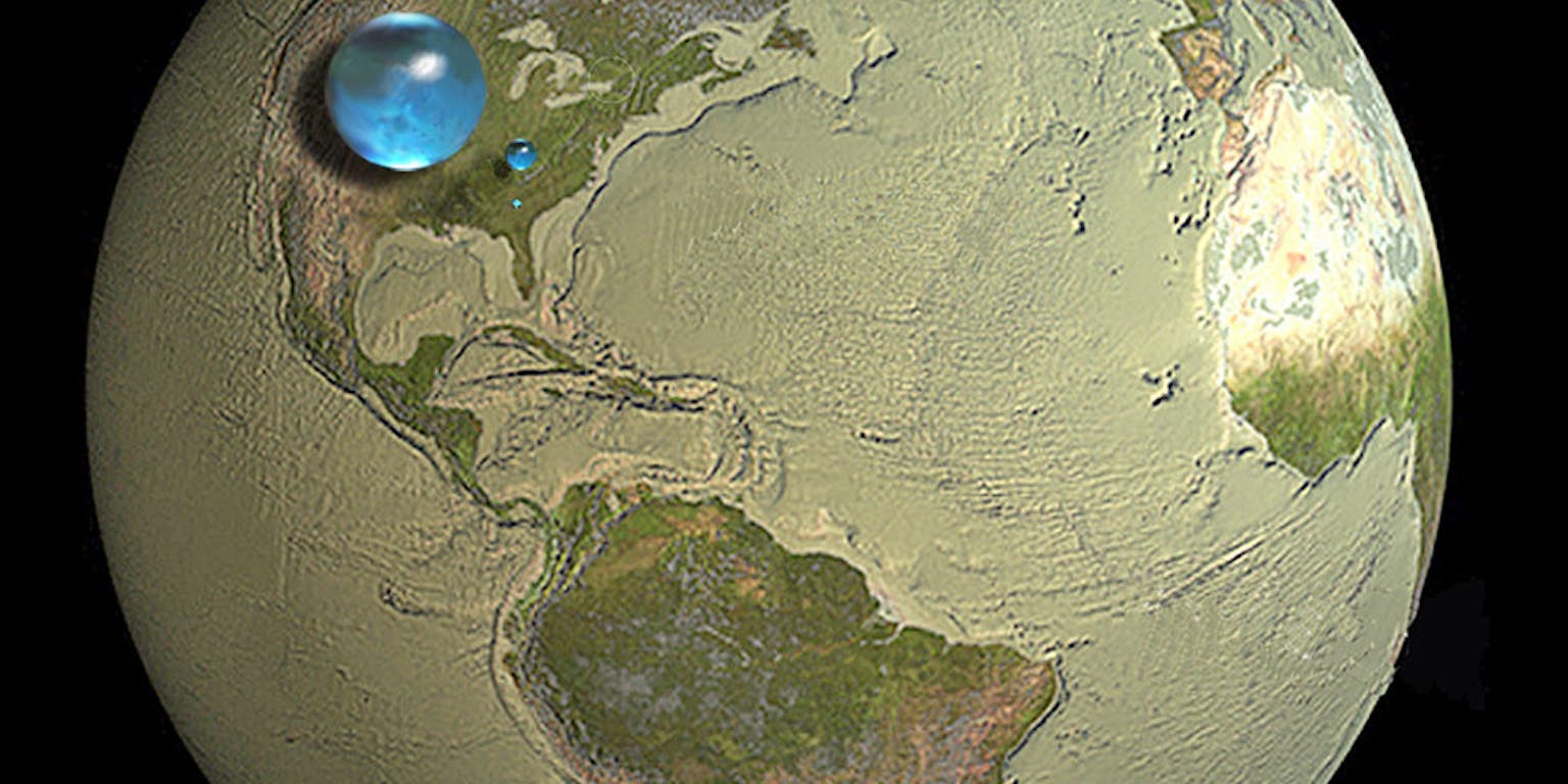 Wanneer je al het water in de oceanen in één bol verzamelt, is dat in vergelijking met de aarde maar een klein bolletje.