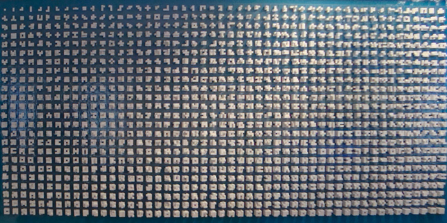 De selectie van 1200 figuren is in 24 rijen van 50 op een groot paneel geplakt en hangt nu als het kunstwerk Eén Model bij het bedrijf Xelion in Delft.