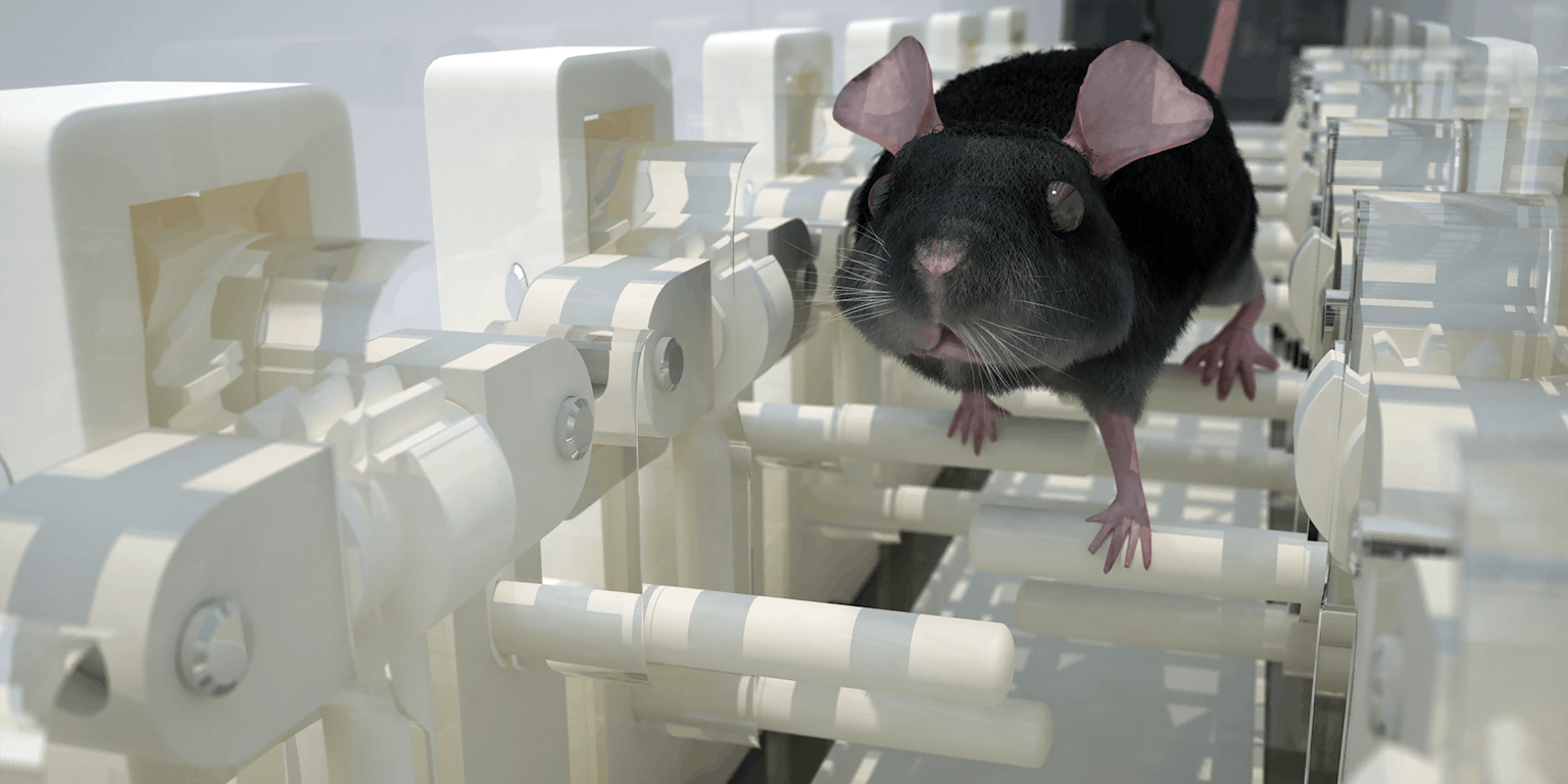 Een animatie van een muis in actie op de Erasmusladder. De opstelling kan goed gebruikt worden om hersenfuncties te testen.