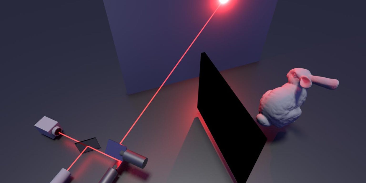 Stanford Computational Imaging LabHet systeem bestaat uit een beweegbare laser en een gevoelige sensor die de lichtintensiteit op een bepaald punt bepaalt. De wetenschappers gebruiken een wand of ondoorzichtig doek om een object te verhullen voor hun meetsysteem. Met laserlicht dat via een tweede muur op het object valt, én weer via diezelfde muur terugkaatst naar het lasersysteem vormt een computer een beeld.