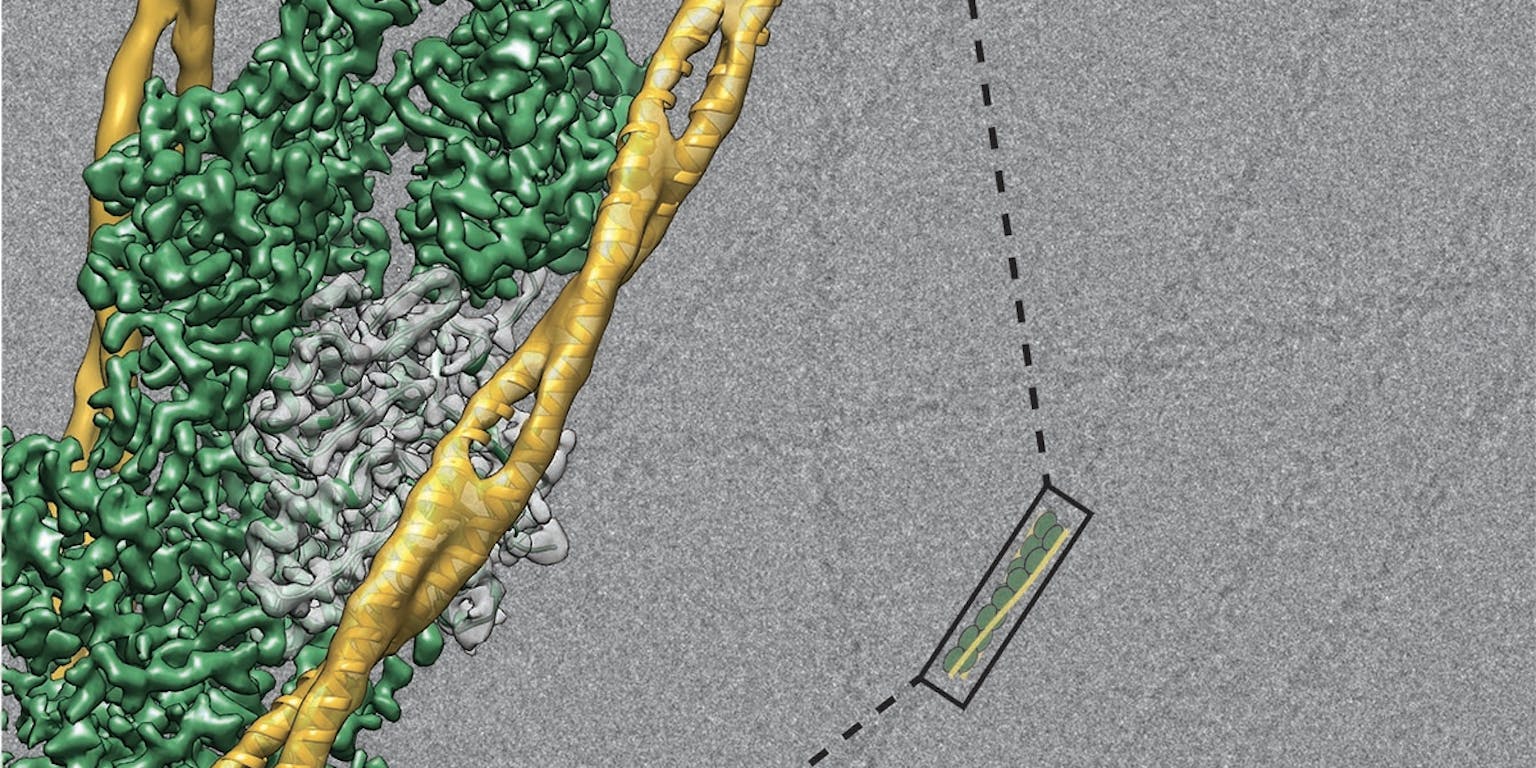 Reconstructie van een actinefilament, een aaneenschakeling van eiwitten die het cytoskelet van een cel vormt. Het beeld is gebaseerd op gegevens verzameld door een Titan elektronenmicroscoop met Falcon camera.