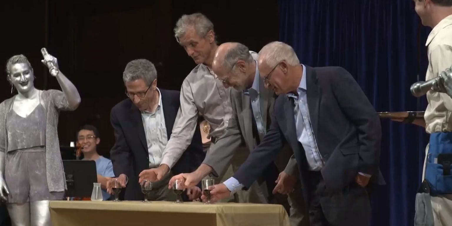 Vier echte Nobelprijswinnaars testen of mensen inderdaad kunnen proeven, dat er één vrouwelijk fruitvliegje in hun glas wijn verdronken is (Ig Nobelprijs voor biologie).