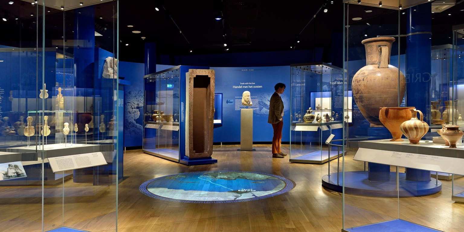 Oudste Griekse zaal met invloeden van omringende landen in Rijksmuseum van Oudheden. In het midden een projectie op de grond met onder andere handelsroutes uit deze vroege periode (3000-500 v. Chr.)