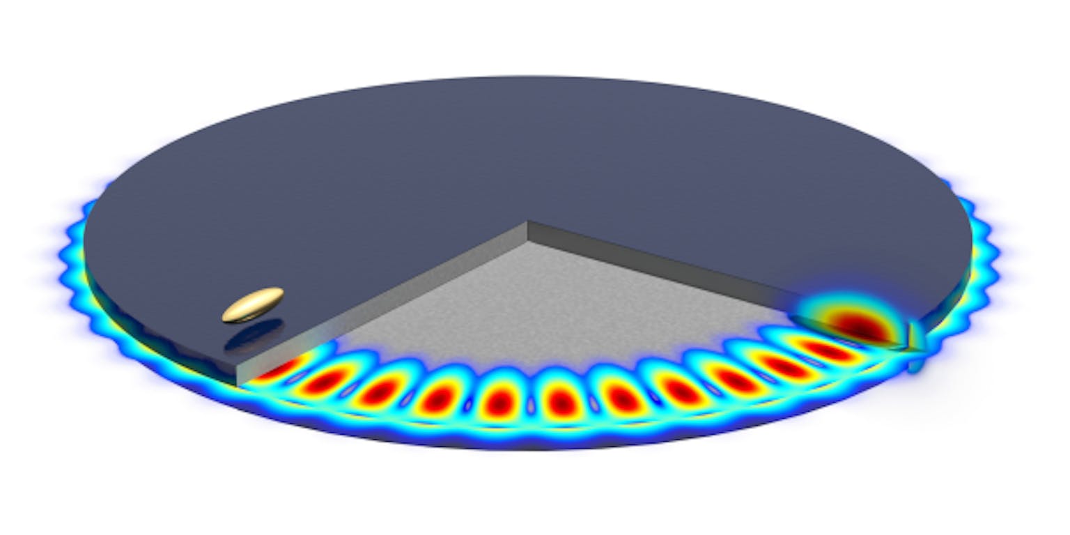 Een plaatje van het soort structuren waar ik onderzoek naar doe. Licht dat gevangen is in de platte schijf kan koppelen aan de gouden antenne daar bovenop. In de uitsnede zie je waar het licht in de schijf geconcentreerd zit.