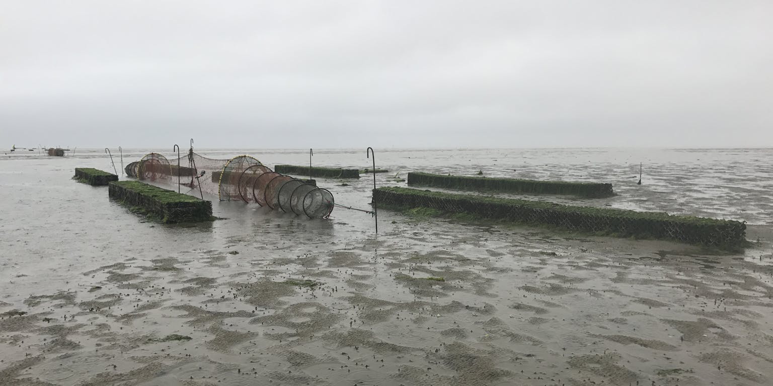 Bij eb vallen de kratten droog. Temmink loopt ernaartoe en peurt er met zijn vinger in. Hij haalt er een klein mosseltje uit. Het is vooral bedoeld voor de jonge beestjes. “Larven drijven in het water en ze houden ervan om zich te vestigen aan vezelig materiaal. Normaal zijn dat de byssusdraden van grotere mossels, maar die zijn hier nog niet. In deze kratten hebben we daarom kokosvezel aangebracht. Daar zitten de mosseltjes aan vast.”