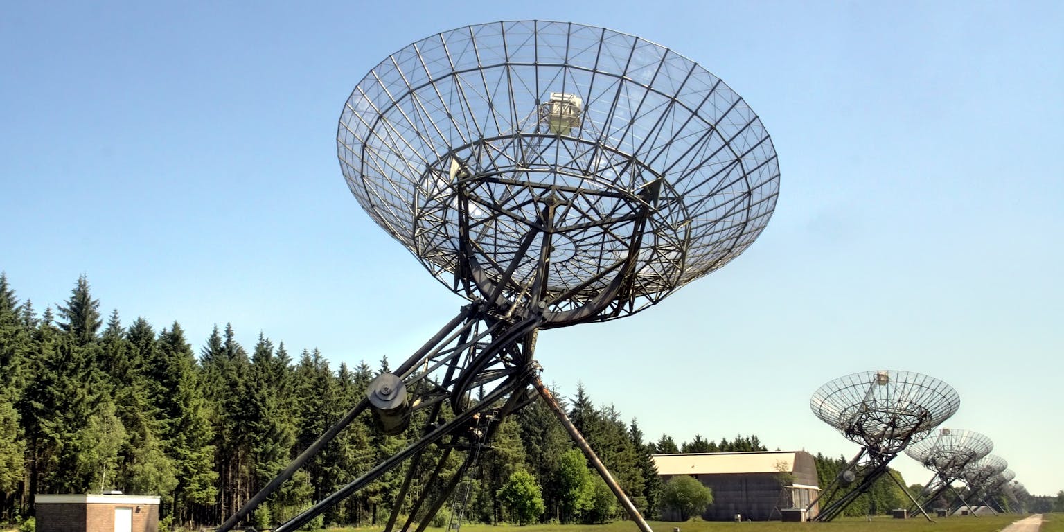 Twaalf statige en enorme schotelantennes staan hier keurig uitgelijnd op een smalle grasvlakte. Goed verborgen in het dichte bos en strak gericht op de hemel. De nietsvermoedende passant zou al snel denken dat hij hier is gestuit op een verscholen stukje afluistertechniek van het leger. De werkelijkheid is dat ze hier juist zo weinig mogelijk met aardse radiosignalen te maken willen hebben.