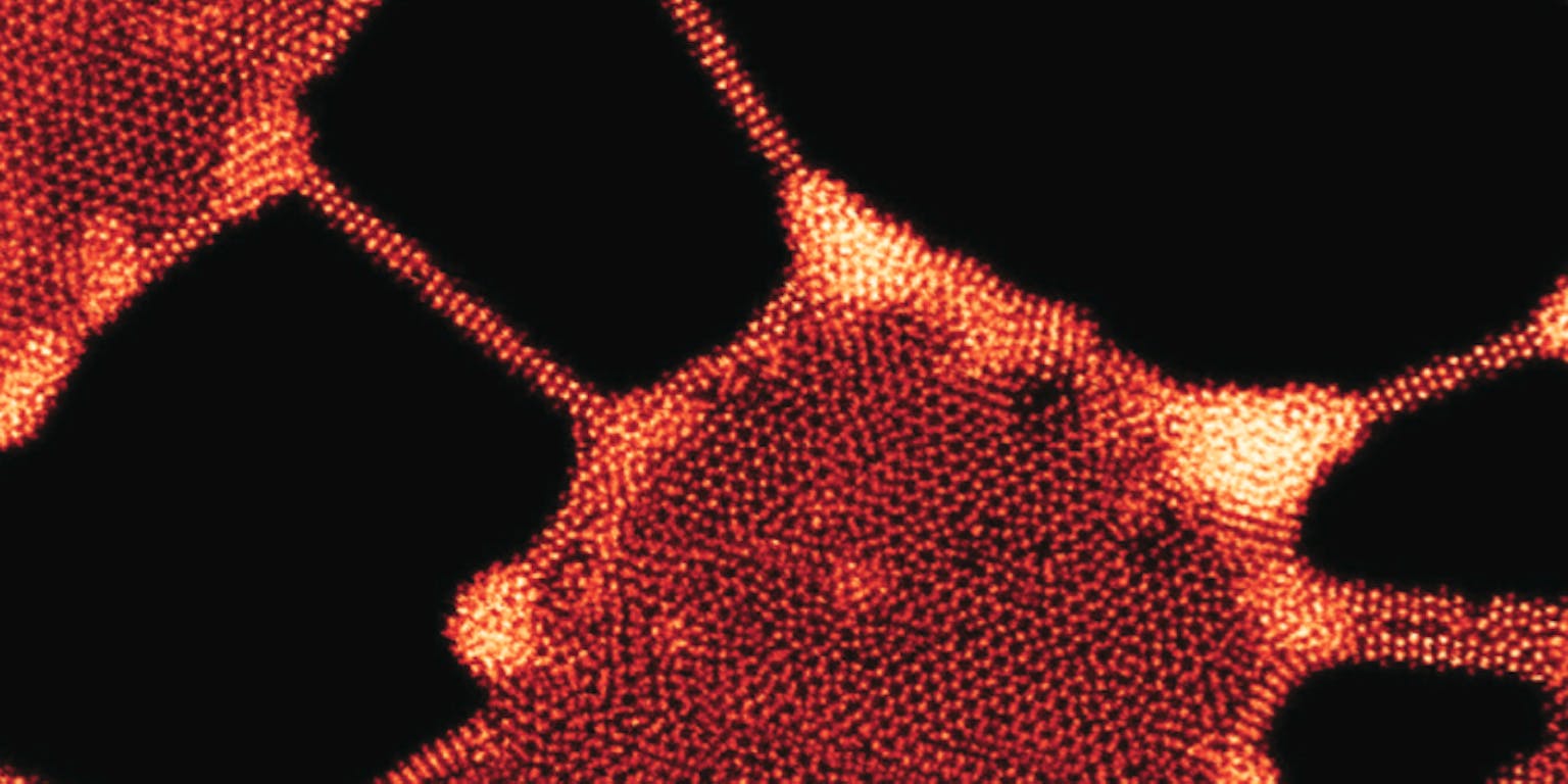 De gaten in de plakken van molybdeen en seleen. Tussen deze gaten bleven de dunne nanodraden over. Het witte balkje onderin meet 2 nanometer.