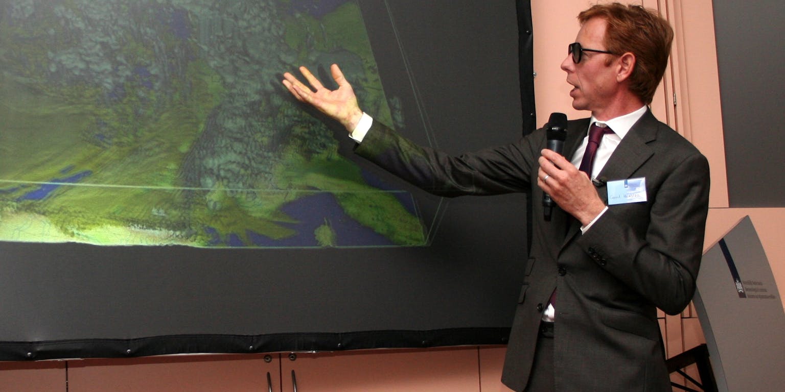 Gerrit Hiemstra presenteert het weer van 2050, met een 3D-brilletje, bij de presentatie van de KNMI´14 scenario´s voor het klimaat van de toekomst in Nederland.