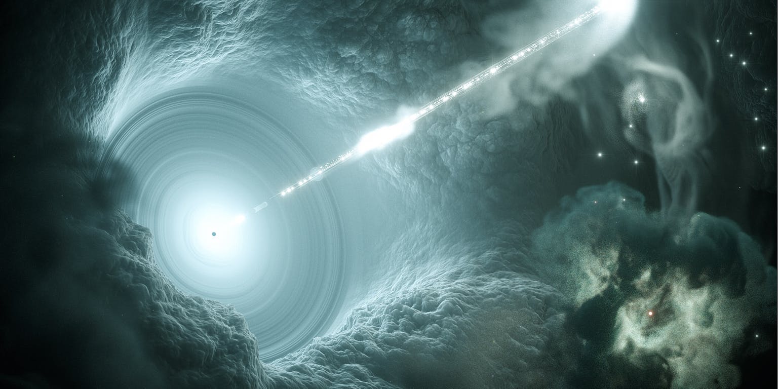 Impressie van de actieve kern van een sterrenstelsel. Een zwart gat wordt omringd door een schijf van materie die er met enorme snelheid omheen draait. Het zwarte gat stuurt een smalle en krachtige stroom van deeltjes en straling het universum in.