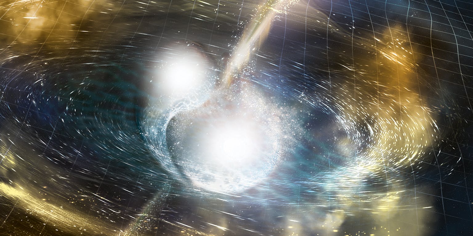 Het spektakel begon op 17 augustus 2017 om 14:41 uur met de waarnemingen van zwaartekrachtgolven door de twee LIGO-detectoren in de Verenigde Staten en de Virgo-detector in Noord-Italië. Voor een periode van ongeveer 100 seconden waren de golven in de ruimtetijd te meten, veroorzaakt door de allerlaatste omwentelingen van de twee neutronensterren voordat ze op elkaar stortten. In de laatste momenten draaiden de neutronensterren met massa van 1,1 en 1,6 keer die van onze zon meer dan 500 keer per seconde om elkaar heen, met een duizelingwekkende veertig procent van de lichtsnelheid.