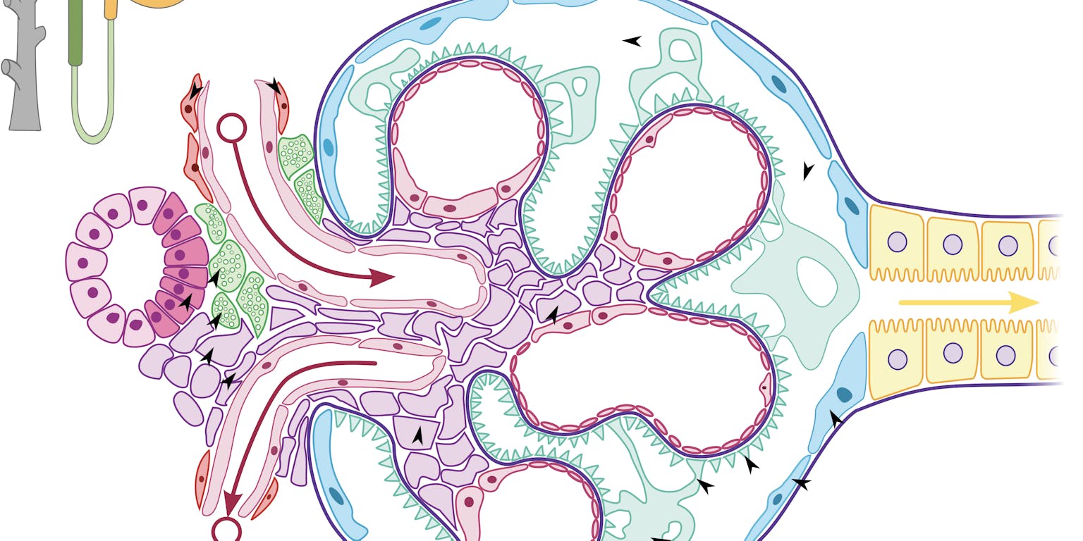 In de nierfilters zitten cellen die het hormoon renine uitscheiden (zie felgroene cellen in figuur hierboven). Renine speelt een belangrijke rol in het regelen van de bloeddruk en de water-zoutbalans in het lichaam. Amerikaanse wetenschappers lieten in 2015 zien dat deze renine-producerende cellen eigenschappen van stamcellen hebben: ze hebben de mogelijkheid om te veranderen in andere cellen van de nierfilter. Bijkerk: “In muizen waarin de nieren beschadigd zijn, zagen ze dat de renineproducerende cellen uit de nierfilters zich omzetten in andere cellen. De nier probeerde zichzelf te repareren.”