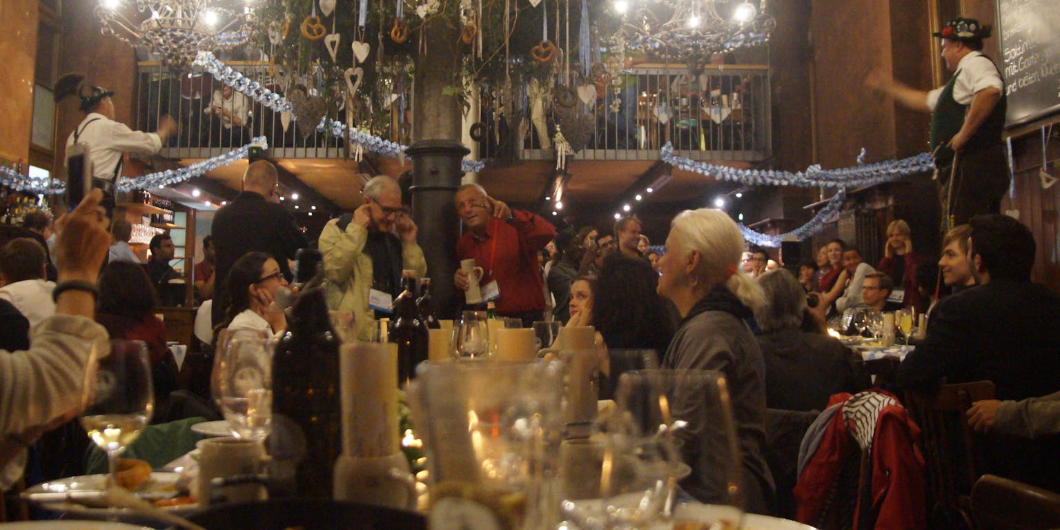 Arnout JaspersHelaas, voor menig wiskundige, kan de boog niet altijd gespannen zijn. Daarom heeft het Heidelberg Laureate Forum ook een avondprogramma, met als vast onderdeel de Beierse avond. Bierbuikige mannen in lederen broeken en kniekousen laten zwepen knallen boven het publiek. Rijpe vrouwen in dirndl-jurk zwieren in het rond op drievingerige accordeonmuziek. Ik zeg niks… Tot slot moesten de wiskundigen nog meedoen ook, wat slechts sommige vrouwen onder hen aandurven.