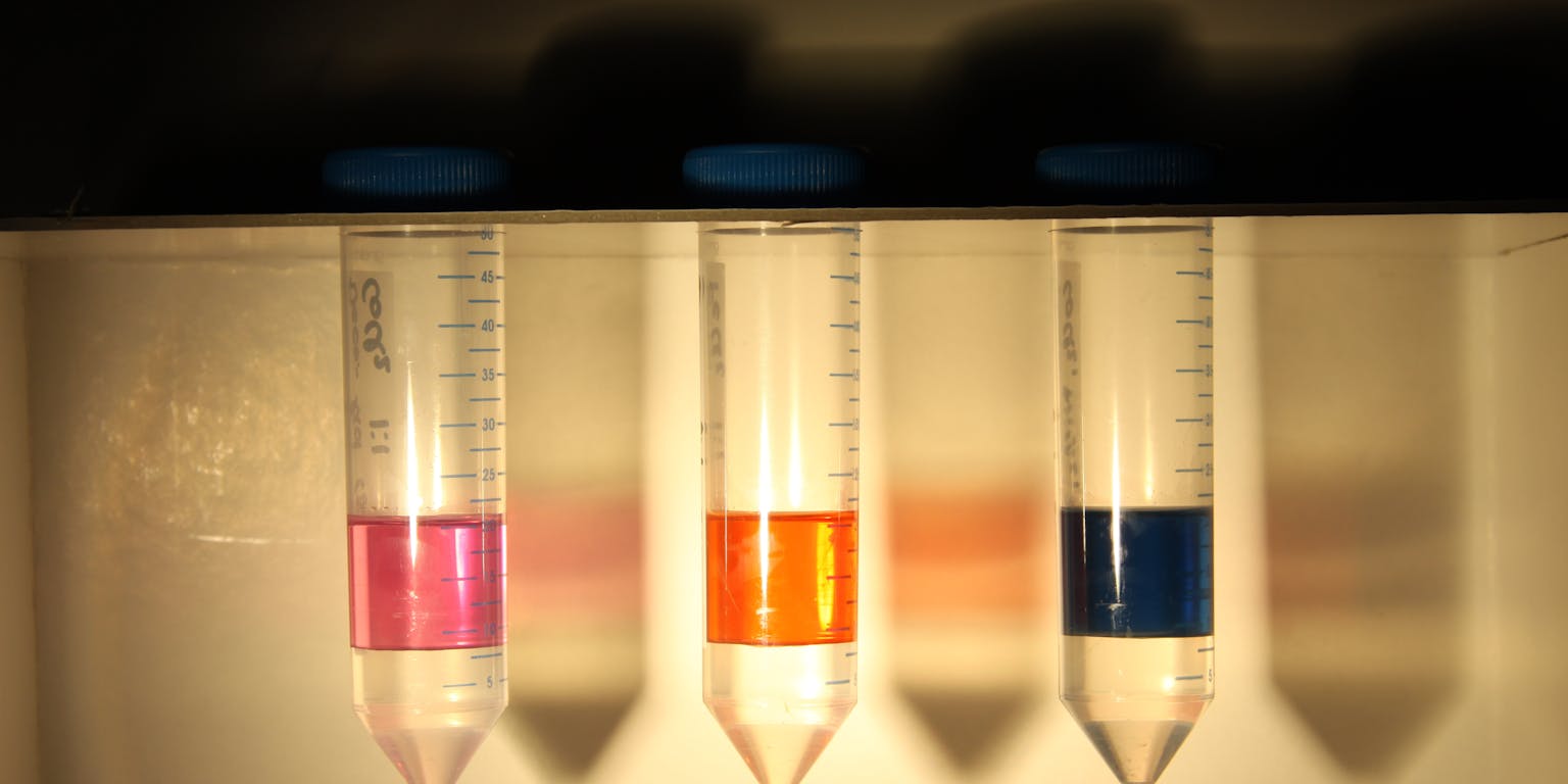 Drie buisjes met onderin een laagje gezuiverd water en daarboven een laagje DES waarin de metaalionen zijn opgenomen. In het linker buisje is kobalt verwijderd, het middelste buisje bevatte ijzer, en in het rechter buisje is een combinatie van kobalt, koper, nikkel en zink verwijderd.