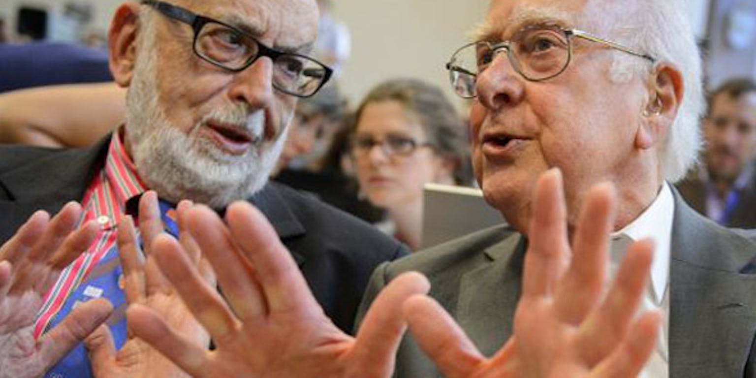De Nobelprijs voor de Natuurkunde gaat naar de Belg François Englert en de Brit Peter Higgs. Ze krijgen hem voor het voorspellen van respectievelijk het Higgsveld en het bijbehorende deeltje, die samen verantwoordelijk zijn voor de massa van elementaire deeltjes.