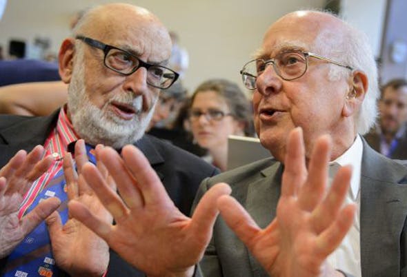 De Nobelprijs voor de Natuurkunde gaat naar de Belg François Englert en de Brit Peter Higgs. Ze krijgen hem voor het voorspellen van respectievelijk het Higgsveld en het bijbehorende deeltje, die samen verantwoordelijk zijn voor de massa van elementaire deeltjes.