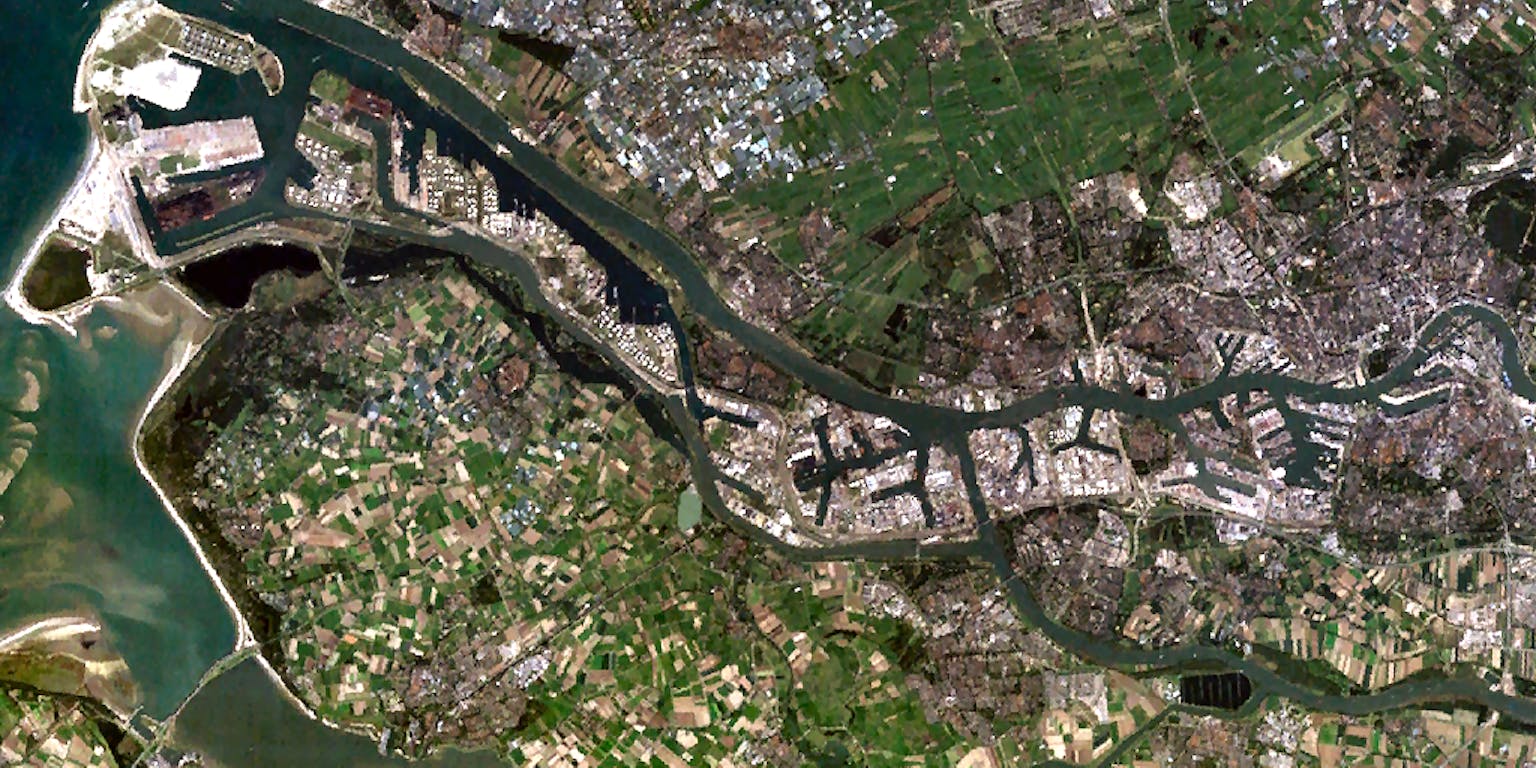 Satellietfoto van de haven van Rotterdam uit 2007 met uiterst links de Maasvlakte en rechts de stad Rotterdam.