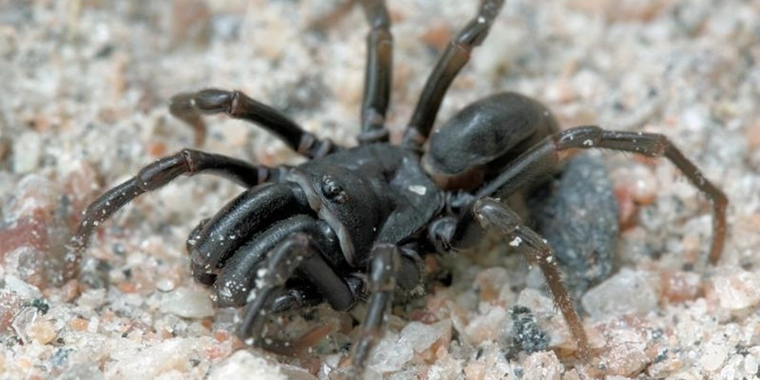 De gewone mijnspin is een van de twee soorten mijnspinnen die in Nederland voorkomt. Je kunt haar herkennen aan haar vooruitstekende zwarte kaken. Mijnspinnen zijn de enige vogelspinnen die in Nederland leven.