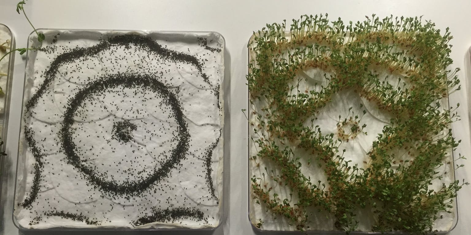 De installatie ‘Sound Sowing’ van Jet Vink maakt geluid zichtbaar via zaaipatronen van gewassen. Door de zaden op een plaat te leggen, die door bijvoorbeeld muziek of een andere geluidsbron gaat trillen, raken de zaden in een bepaald patroon verdeeld. Door ze in dat patroon te planten, wordt na verloop van tijd het geluid zichtbaar als de planten gaan groeien.