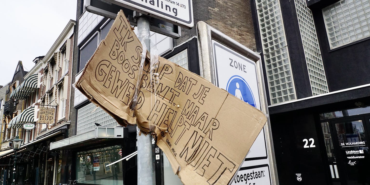 Bord geplaatst na de rellen die eind januari 2021 plaatsvonden na het invoeren van de avondklok. ‘Ik snap dat je boos bent, maar geweld helpt niet.’