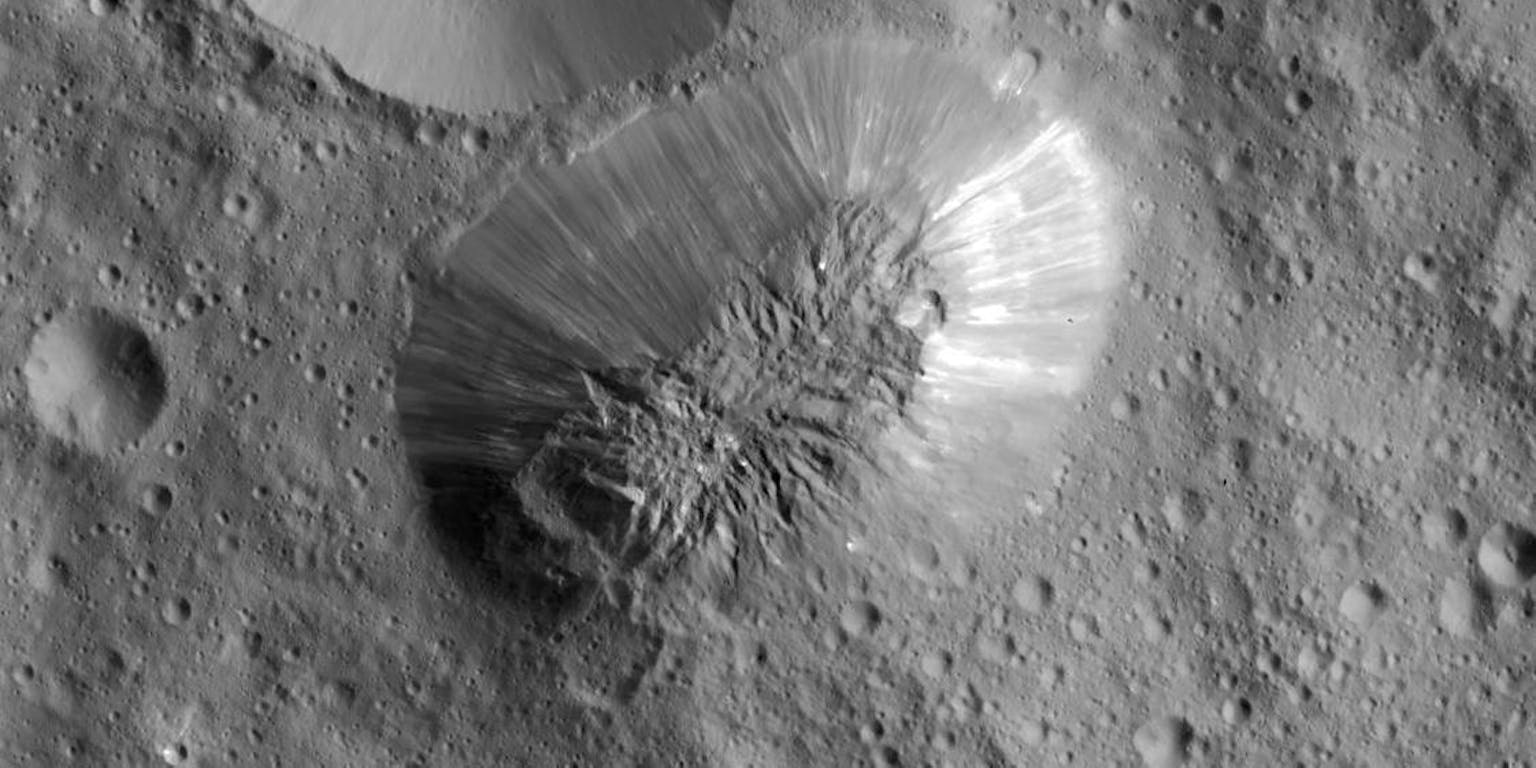 De Occator-krater op Ceres meet ongeveer 92 kilometer en is vier kilometer diep. In het heldere midden zijn volgens wetenschappers sporen van ijsvulkanisme zichtbaar. Helder is overigens relatief: omdat Ceres over het algemeen een erg donker hemellichaam is, zijn de lichtste plekken zo ‘helder’ als asfalt.