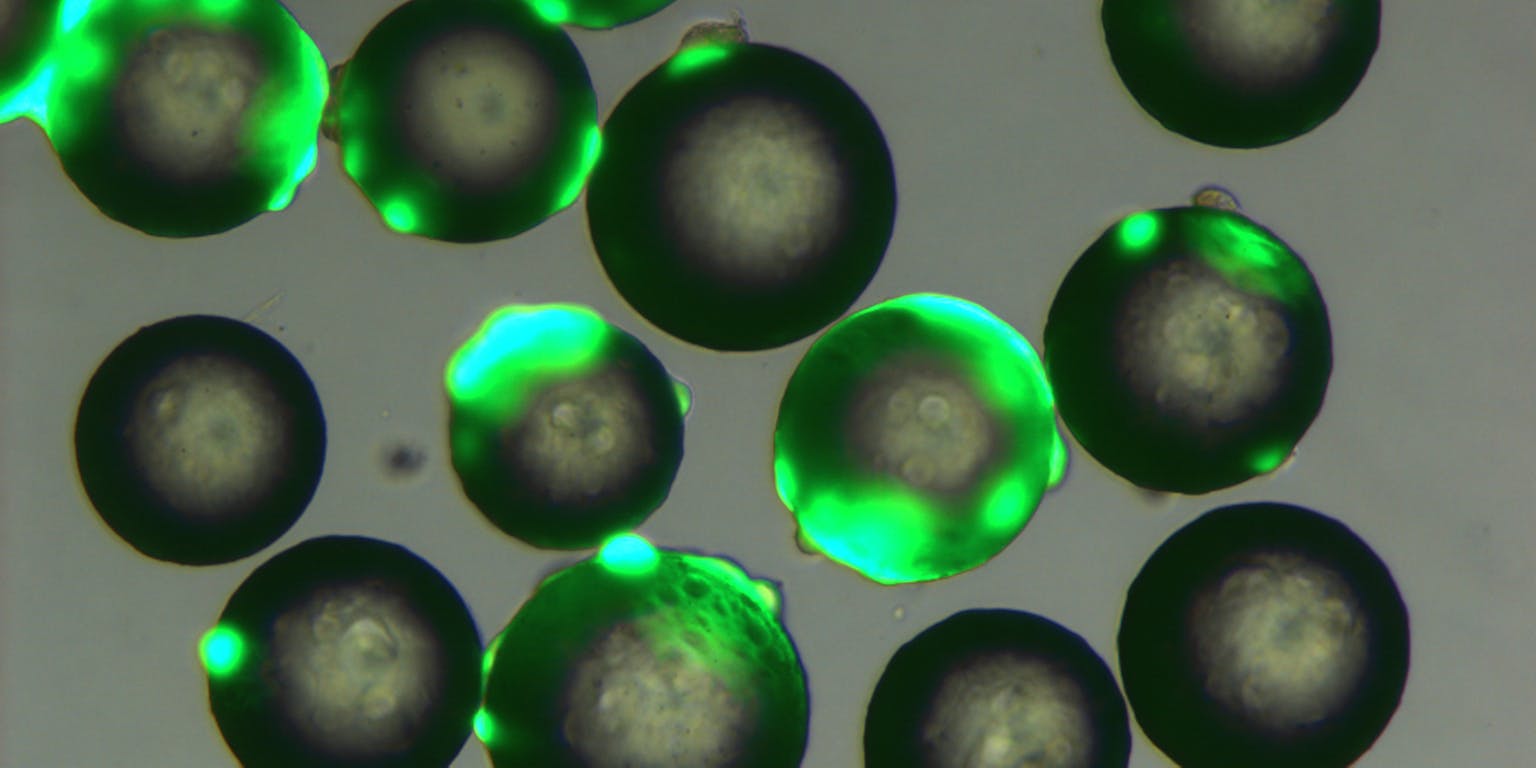 Maaike Roefs, Xpand BiotechnologyDe ‘gestripte’ bètacellen (die geen insuline meer produceren maar wel geschikt zijn om te delen) komen, voorzien van een fluorescerend labeltje, uit Leiden aan bij Xpand. Om de cellen te kweken in de bioreactor (en ze niet met het medium weg te laten spoelen), moeten ze hechten aan een zogenoemde ‘microcarrier’: een knikker van tweehonderd micrometer met eiwitten eromheen, waarop cellen goed groeien.